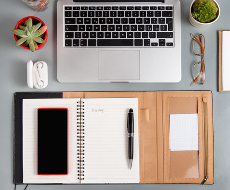 Laptop, cell phone and opened agenda on a grey desk top view. Business concept