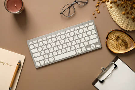 Aesthetic feminine workspace with keyboard, glasses, paper notebook, clipboard, office stationery. Home office desk. Flat lay, top view.