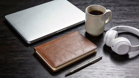 Working tools - laptop, notebook, pen, headphones, phone and a cup of coffee on a table, picture from above
