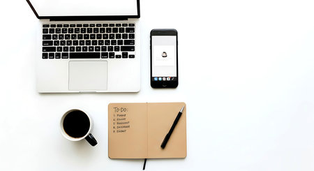 Workplace, white desk table with laptop, smartphone, coffee cup and notepad, Top view with copy space