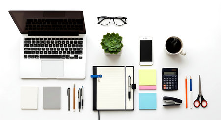 Top view of modern workplace with laptop, notebook, stationery and plants on white background