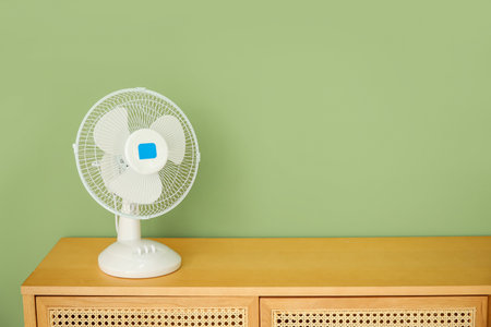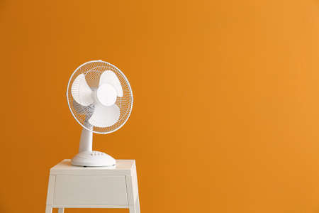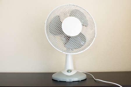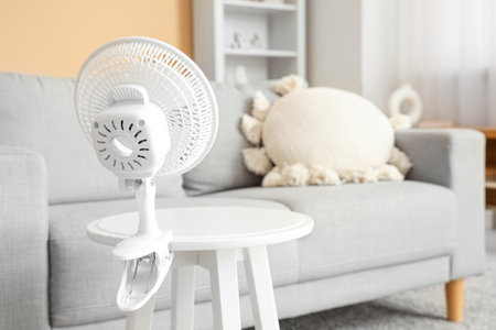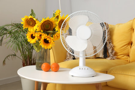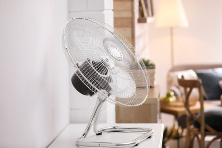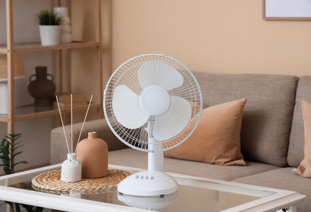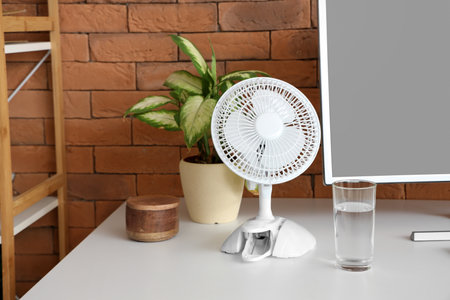 Modern fan with a glass of water on the table at home. Concept of abnormal summer heat and thirst
