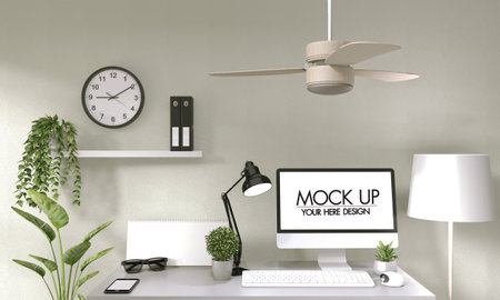 Mock up poster computer in office zen style and decoration on top table office.3D rendering