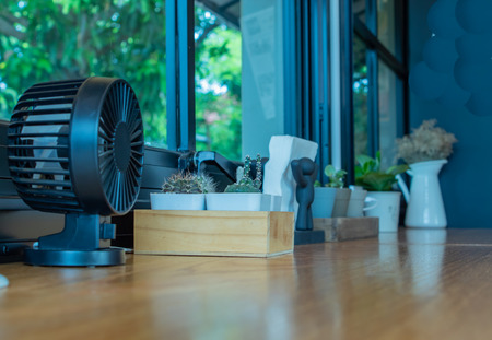 Transparent glass of clear water and a small table fan on a wooden table closeup, shallow depth of field