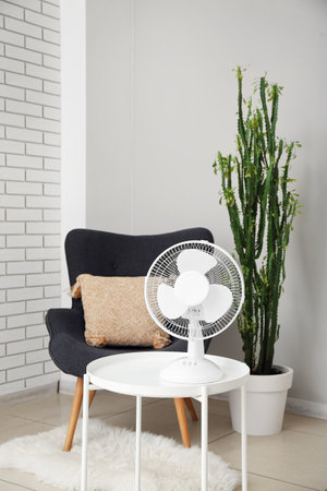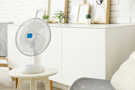 Interior of light living room with clock, houseplant and modern fan on shelving unit