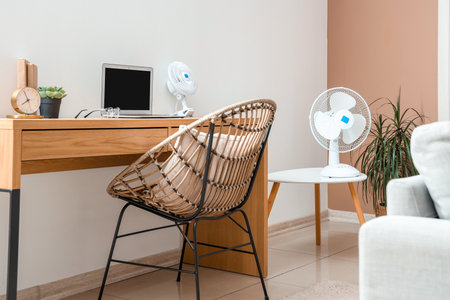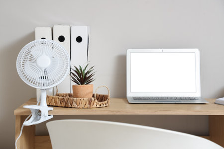 A threebladed fan is switched on and positioned in front of a laptop, creating a cooling breeze that enhances the overall workspace environment
