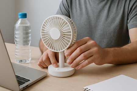 Man turning on desk fan next to laptop and water bottle at workstation. concept of cooling, desk setup, office environment.