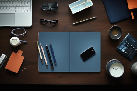Top view of office table with a office supplies. Generative AI