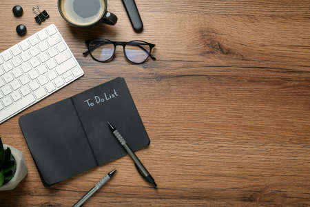 Flat lay composition with unfilled To Do list in notepad, cup of coffee and computer keyboard on wooden table, space for text