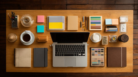 top view of a neatly organized office desk with laptop, notepad, and coffee cup, created with generative ai