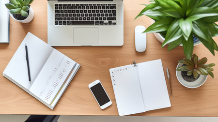 An organized workspace showcases a laptop, smartphone, and headphones. Additional elements include a planner, pen, coffee cup, and a small potted plant. The setting appears bright and modern with neutral colors. Suitable for illustrating technology, business, or lifestyle themes.