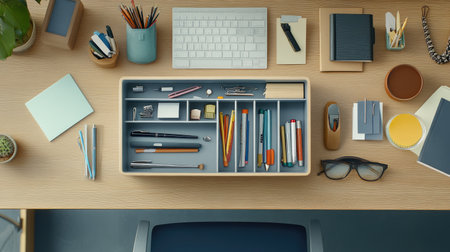 an office table desk meticulously arranged as a workspace, featuring various office supplies neatly laid out. The scene exudes an ambiance of efficiency and professionalism