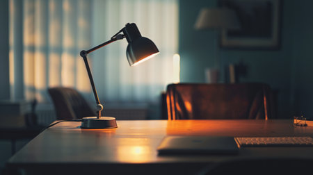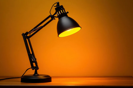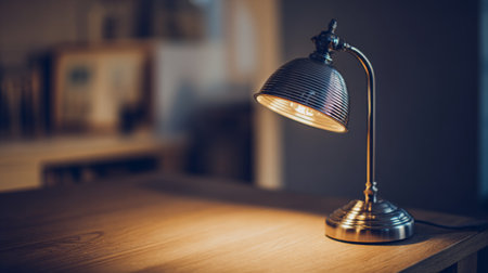 Stylish desk lamp on wooden surface with warm bokeh light background, symbolizing comfort, work, and cozy night ambiance.