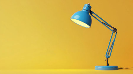 A stylish blue desk lamp stands on a smooth surface against a vibrant yellow background, creating a modern vibe ideal for any workspace or home setting.