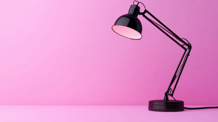 This image features a stylish black desk lamp positioned gracefully against a bright pink background. Ideal for showcasing modern decor, lighting, or workspace themes.