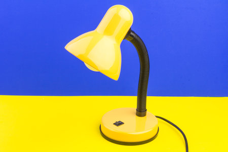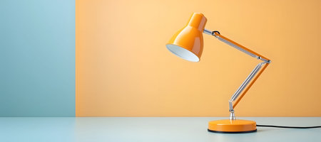 A bright yellow desk lamp casts warm light across a workspace that features a vibrant blue and orange background, creating an inviting and creative atmosphere.