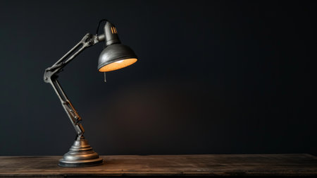 Vintage desk lamp on wooden table against dark background with copy space