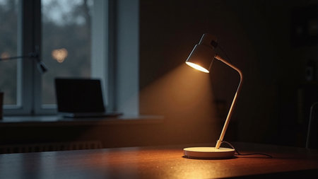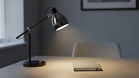 A minimalist desk lamp casting a focused beam of light on a workspace, promoting productivity and concentration