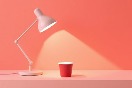 Pink table lamp and red paper cup still life scene
