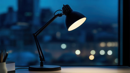 A stylish desk lamp brightly illuminates a modern workspace during the evening. The urban backdrop adds depth, creating a cozy and inviting atmosphere perfect for productivity.