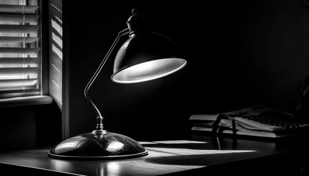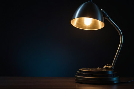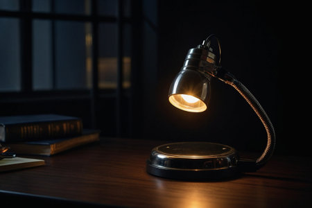 A silver desk lamp with a metal shade illuminates a dark room, casting shadows on the table and creating a dramatic contrast.
