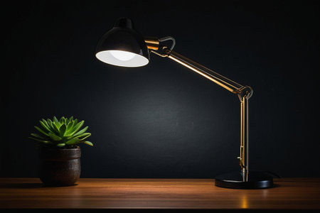 desk lamp on the table with succulent plant on black background