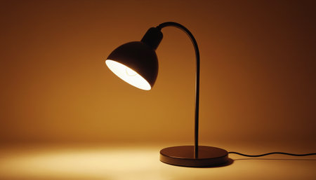 A desk lamp is placed on a wooden surface that is lit by soft background lighting creating a warm glow.