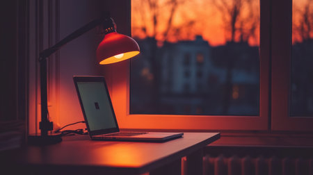A serene home office setting with a glowing lamp beside a laptop, showcasing a beautiful sunset through the window, perfect for cultivating inspiration and comfort.