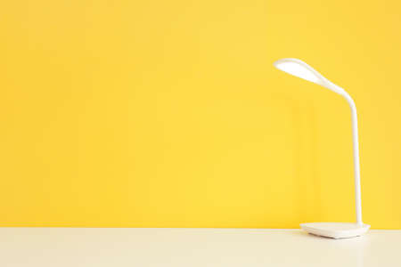 Modern glowing lamp on table near color wall