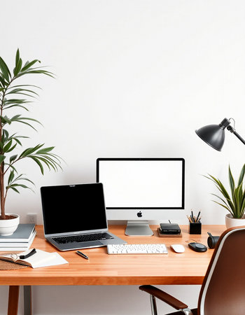 A laptop computer sits open on a bright white desk, accompanied by a keyboard, mouse, and a small potted plant. The setting is clean and minimalist, with neutral colors and soft lighting. This image could be used for various purposes, including website design, advertising, and marketing materials.