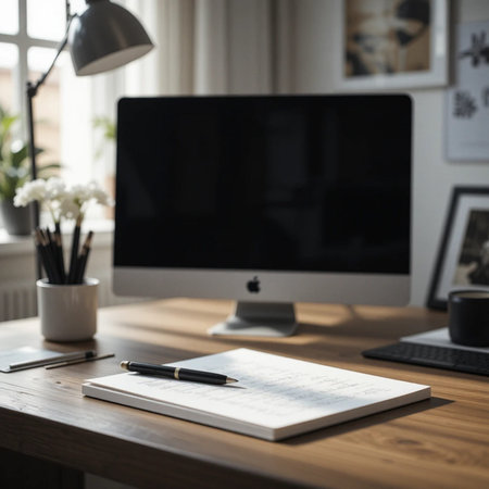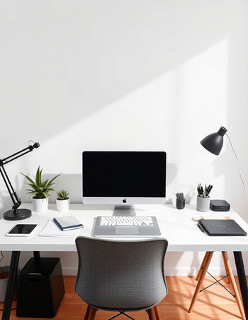 Scandinavian home office with soft morning light creating a white and inviting atmosphere