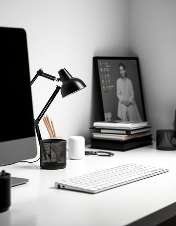 Modern workspace with computer, keyboard, mouse, lamp, and plant on white table.