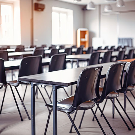 morning sunshine on desks and chairs in empty classroom - waiting for students to come in