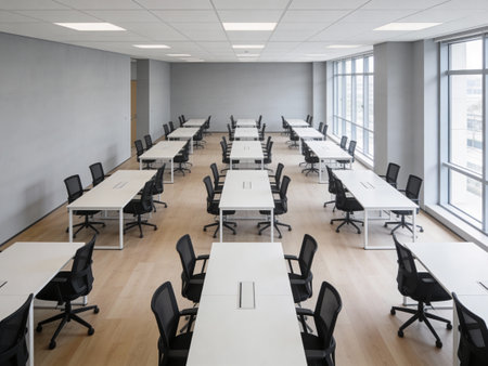 Empty classroom or conference room with desks and chairs