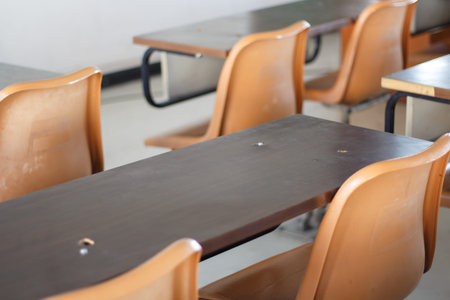 Chairs and tables inside empty classroom in primary school. Close up