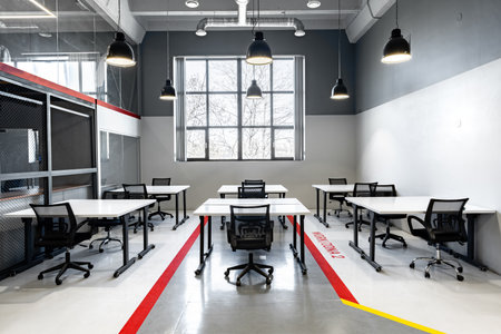 Interior of modern coworking space without people, containing tables and chairs
