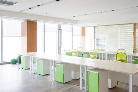 Corporate office interior and desk close up with blank copy space