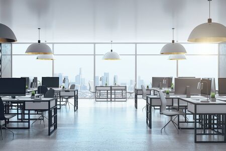 Minimalistic coworking office interior with city view and personal computers on table. 3D Rendering