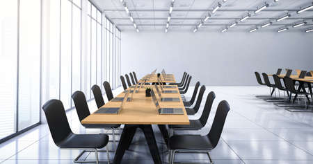Interior of a modern meeting room with white tables and black chairs