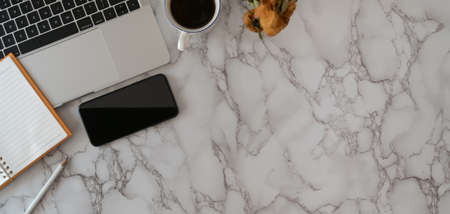 Top view of modern workplace with office supplies and copy space on marble desk background