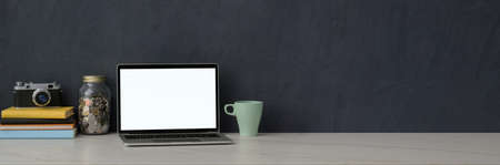 Cropped shot of dark modern concept workspace with copy space, mock-up laptop, coffee cup and decorations on marble desk