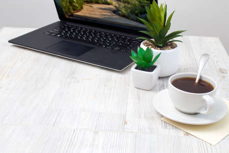 Simple workplace with computer laptop, coffee cup, notebook and succulent plant on white table.