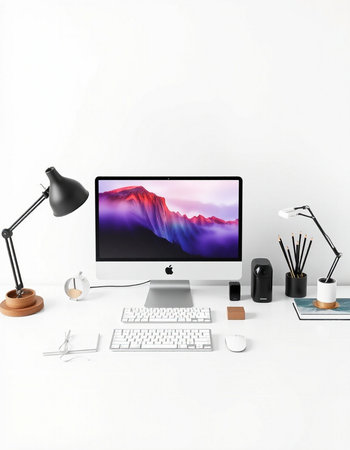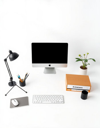 Modern workspace with computer, keyboard, mouse, books and stationery on white background