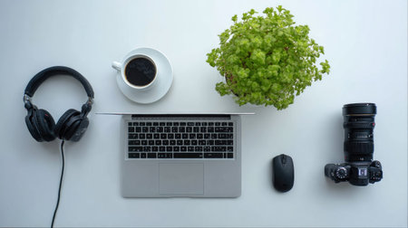 Top view image of coffee cup putting at the center of white working desk that surrounded by computer laptop, eye glasses, potted plant, coffee cup, pencil holder, camera, film and stack of notebook.