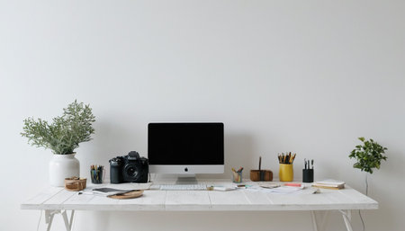 Side view of designer office desk with laptop, painting tools, camera and decorations on white table