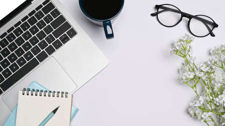 Top view office stuff with notepad, laptop and coffee cup mouse notepad shot.blank screen mobile phone and supplies on white desk workspace and copy space.