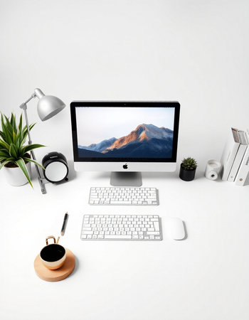Modern desktop computer with blank screen, keyboard, mouse, coffee cup and plant on white background