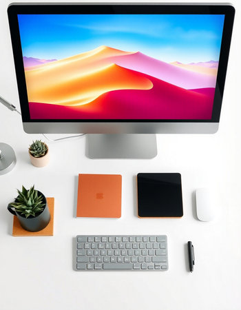 Modern workspace with computer, supplies and decorations. 3d rendering.