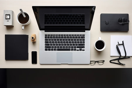 Overhead shot of dark modern workspace with laptop, stationery, coffee cup and copy space on black table