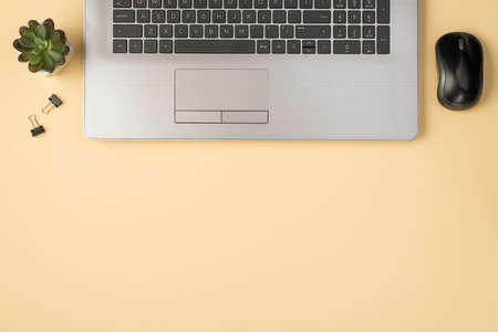 Overhead photo of laptop computer mouse plant and paperclips isolated on the beige backdrop with copyspace